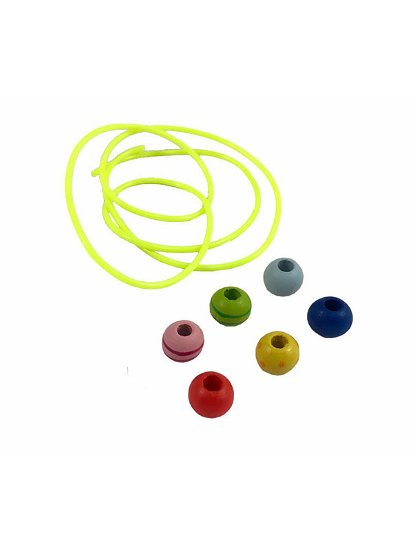 Trä pärlor på tråd i grå tyllpåse. Pärlorna kommer lösa tillsammans med ett plastsnöre. Setet används vid 4-års kontrollen för att bedöma barnets psykomotoriska utveckling och om barnet kan trä pärlorna på tråden.