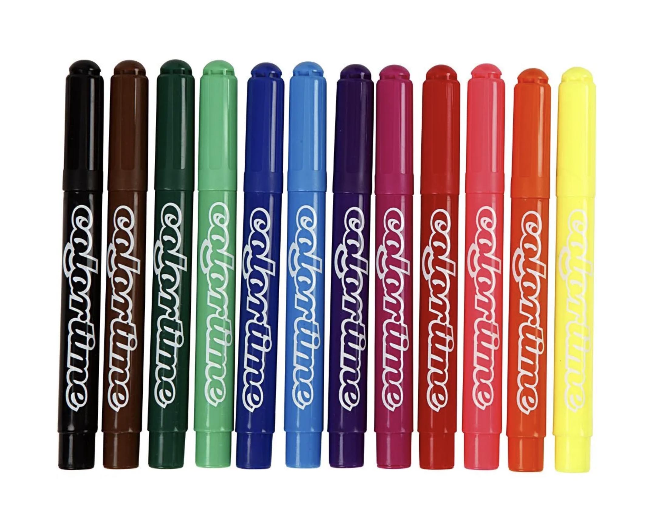 Levereras i plasthink med 12 färger à 3 st. samt 3 extra röda och svarta